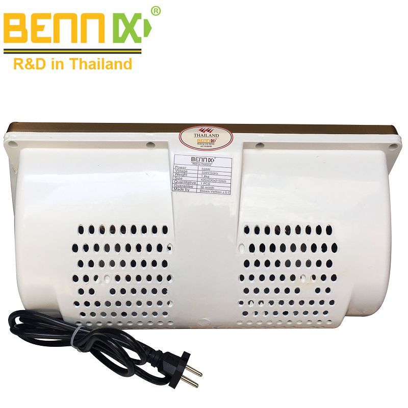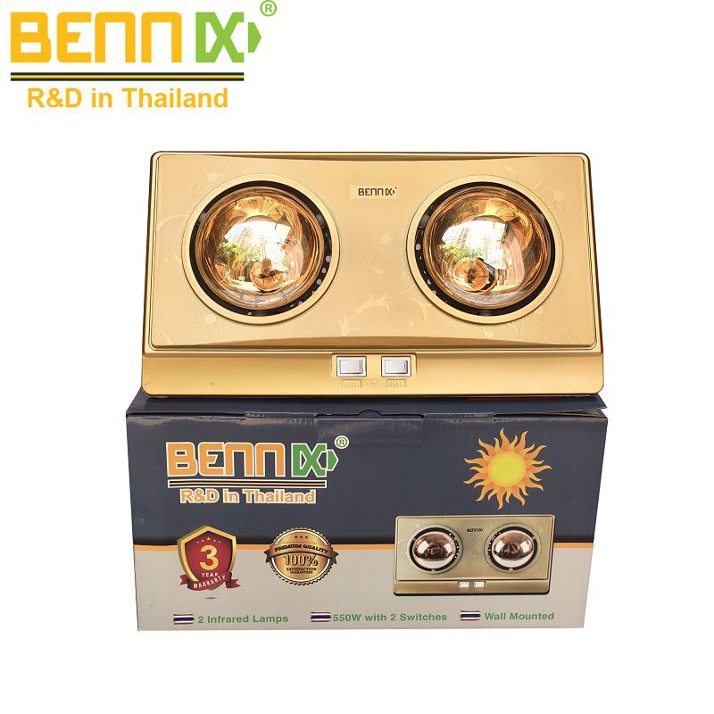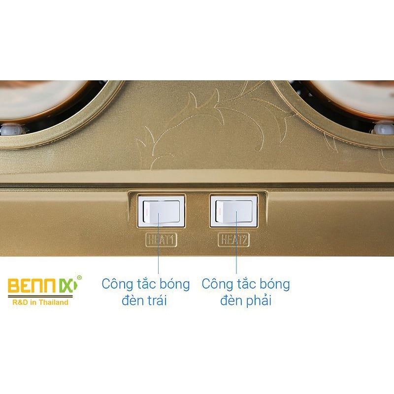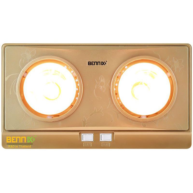 - Bennix BN-02BG được sản xuất theo tiêu chuẩn cao của Bennix Thái lan, sản phẩm có thiết kế đẹp và sang trọng, độ bền cao lên tới 10 năm sử dụng. Đèn sử dụng 2 bóng với tổng công suất 550W có khả năng sưởi ấm phòng có diện tích tới 5m2.